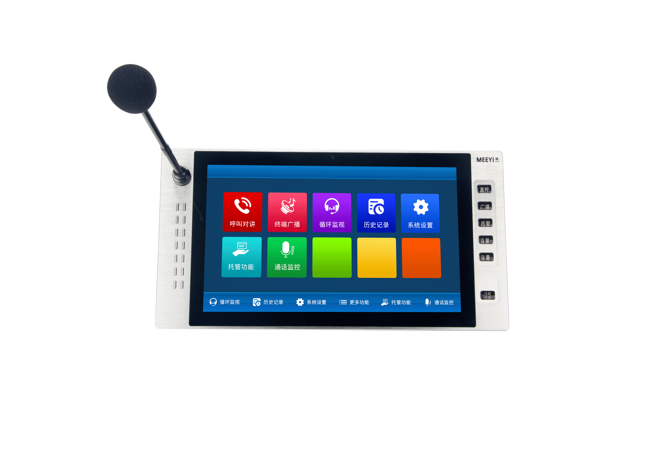 6. 图标选择呼叫功能,每个对讲终端在寻呼话筒触摸屏上对应一个触摸图标,触摸按钮可以中文命名,选中即可呼叫对应终端,操作简单快捷。