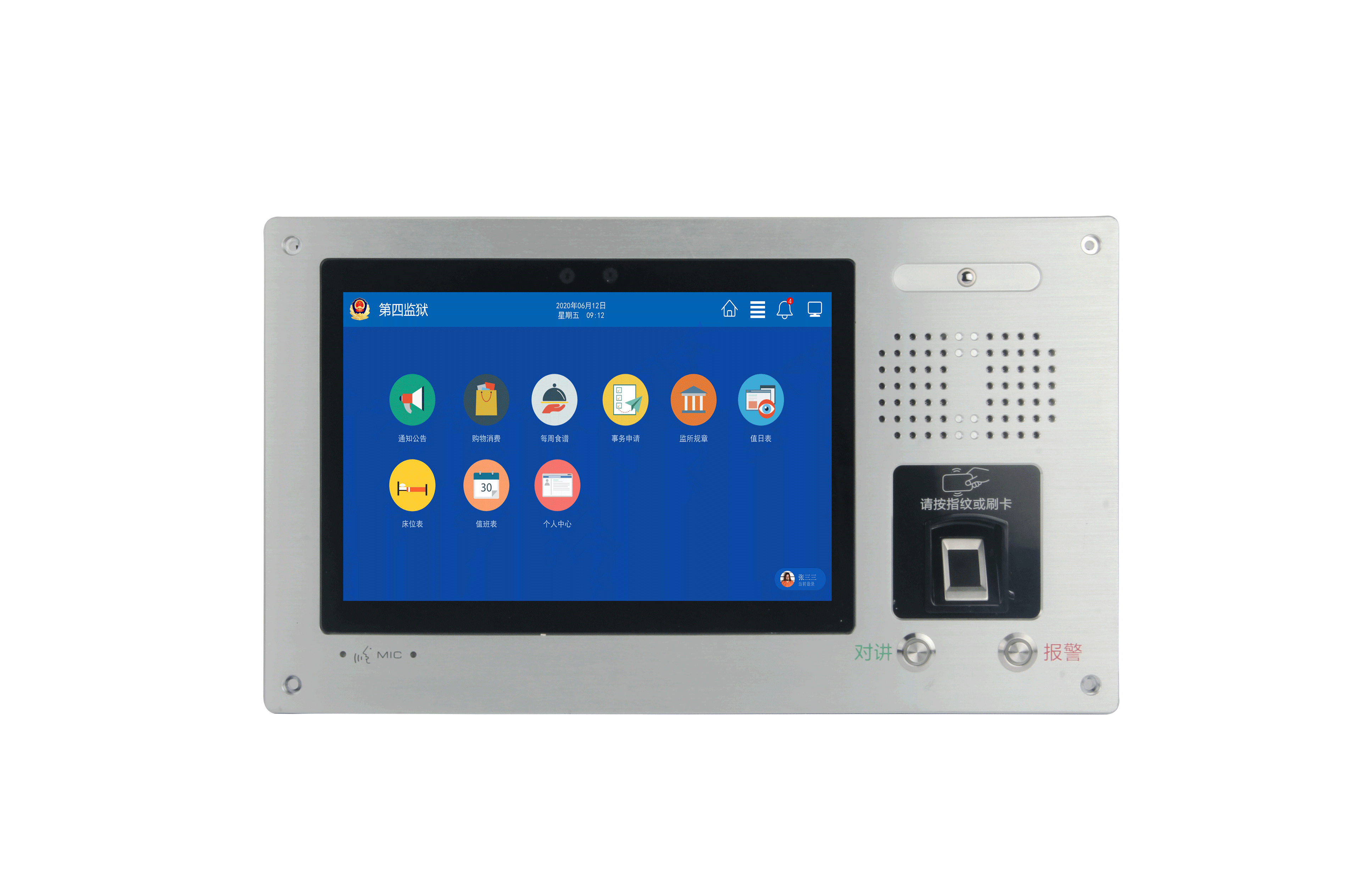 • 监室点名: 在押人员使用IC卡或生物识别方式在智能监仓交互式终端进行点名报道,并将点名结果经监狱内部网络上传至管理后台。点名过程全程使用手环或指纹进行操作,确保了点名的准确性。